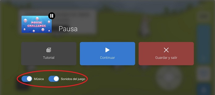 En este menú, verás dos controles deslizantes que te permiten activar o desactivar la música o los sonidos del juego. Cuando el control deslizante está en verde, la música/el sonido está activado. Encienda y apague los controles deslizantes con el dedo, activando o desactivando las opciones deseadas.