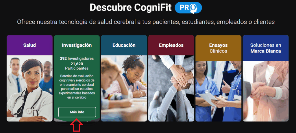 o desplázate por la página de inicio de CogniFit hasta la sección «Investigación» y haz clic en el botón «Más info».