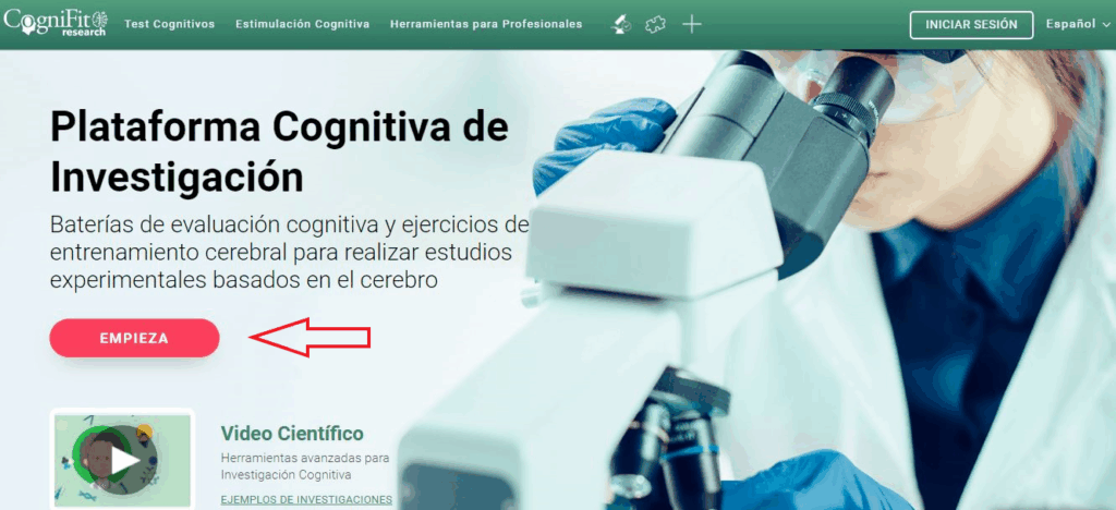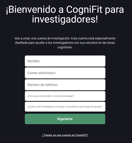 Puedes crear una cuenta para investigadores, accediendo a la plataforma directamente o desde la página principal de CogniFit.