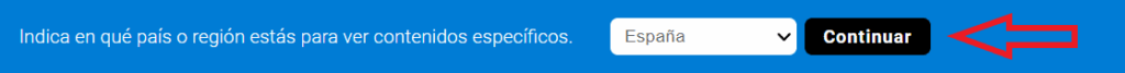 Antes de registrarte tienes que indicar en qué país o región estás. El navegador detectará automáticamente tu ubicación. Para confirmar, pulsa el botón «Continuar» en la barra azul que aparece en la parte superior de la pantalla.