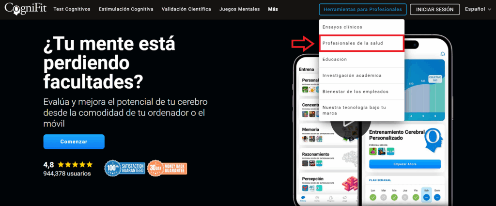 1.1 Para registrarte desde la página principal de CogniFit elige la opción «Profesionales de la salud» en la pestaña «Herramientas profesionales» en la parte superior de la pantalla