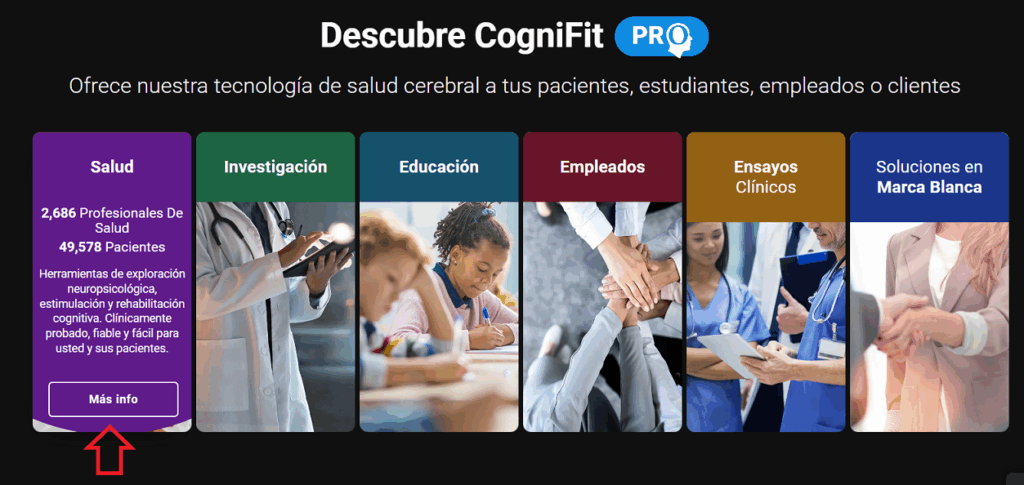 o desplázate por la página de inicio de CogniFit hasta la sección «Salud», pasa el ratón por encima del ícono de la plataforma y haz clic en el botón «Más info».