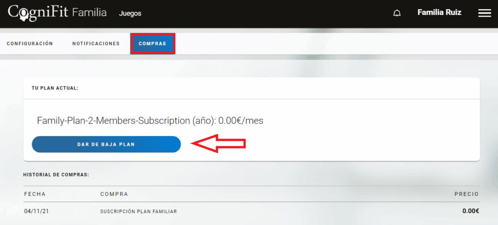 2. En la página de Preferencias, accede a la pestaña de Compras. En esta página verás información sobre el plan de suscripción actual que has adquirido para los miembros de tu familia. Para cancelar la suscripción, pulsa el botón «Dar de baja plan«.