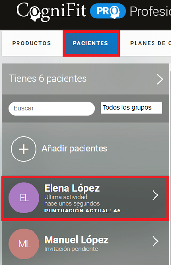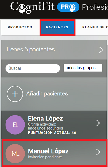 2.1 Haz clic en la pestaña «Pacientes» en la página inicial de tu cuenta y selecciona el paciente que quieres eliminar de tu cuenta profesional.