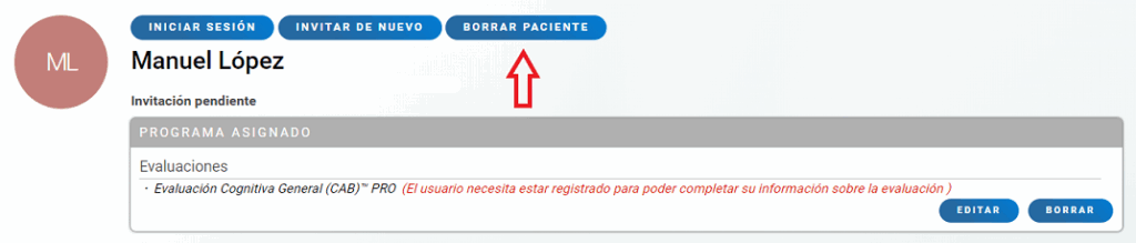 Atención: Recuerda que, una vez eliminado, no te será posible recuperar los datos o la información de ese usuario. Asegúrate que has guardado toda la información necesaria antes de eliminar a dicho paciente. El perfil del usuario continuará existiendo en la base de datos, y tiene la opción de volver a unirse a CogniFit con una cuenta particular.