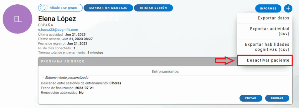 2.2 Se abrirá la página de perfil del paciente. Para eliminar este usuario haz clic en el icono «+«. En el menú desplegable que se abre elige la opción «Desactivar paciente«.