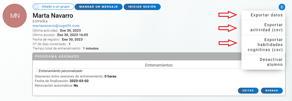 Al hacer clic en el botón Exportar actividad (csv) descargarás el CSV con información sobre las actividades que ha completado el usuario (incluye el tipo de entrenamiento/evaluación, el número de sesión, los juegos hechos, las tareas realizadas, la fecha, las capacidades cognitivas entrenadas, la puntuación media de las habilidades evaluadas y el tiempo total de entrenamiento).