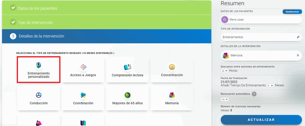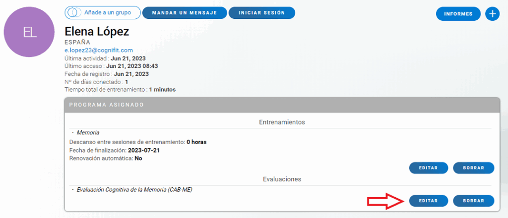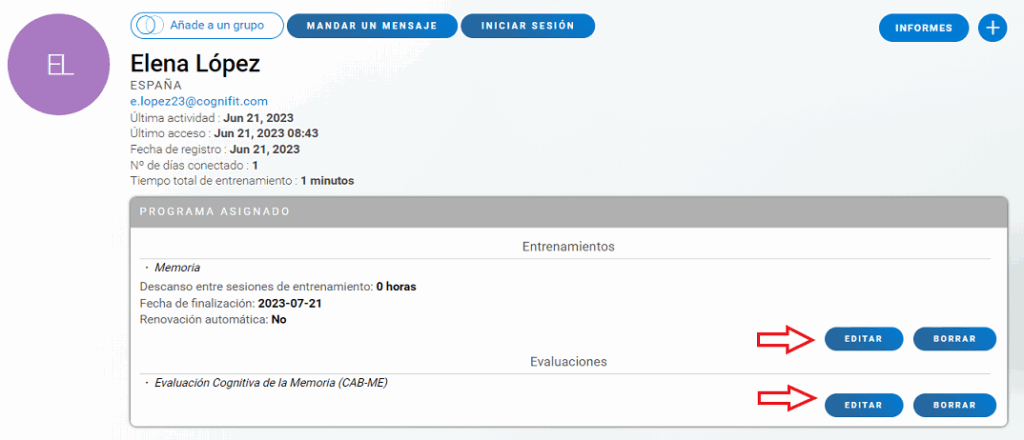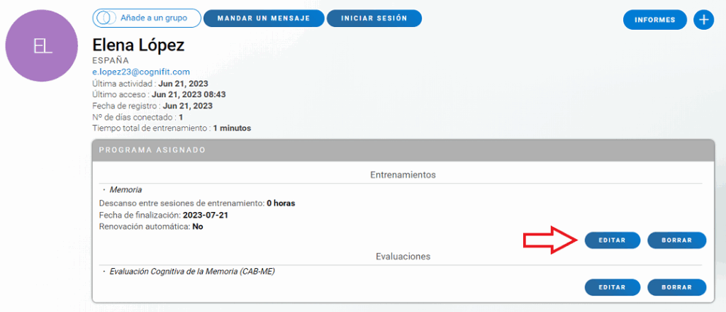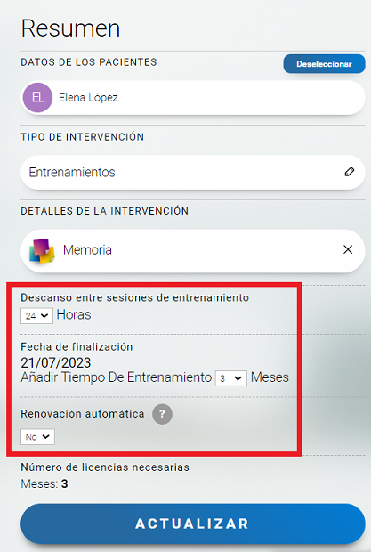 Atención: No puedes reducir el periodo de entrenamiento de los pacientes. Si quieres hacerlo, envía tu solicitud con el correo electrónico del paciente a support@cognifit.com.