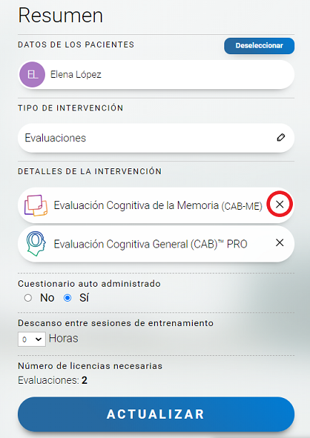 Si quieres sustituir una evaluación anterior por una nueva, haz clic en la «x» que aparece junto a la evaluación que deseas eliminar.
