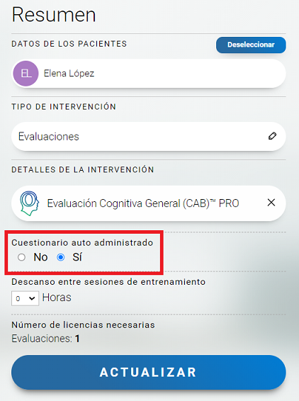 4.1.3 También puedes cambiar la opción de quién responde el cuestionario: profesional o paciente. Haz clic en el botón Actualizar.