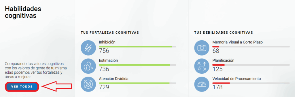 1.1 Accede a tu cuenta de CogniFit y desplázate por la página principal hasta la sección de Habilidades Cognitivas. Aquí podrás ver tus fortalezas y debilidades cognitivas y la puntuación actual de cada capacidad cognitiva. Haz clic en Ver todos para ver más información.