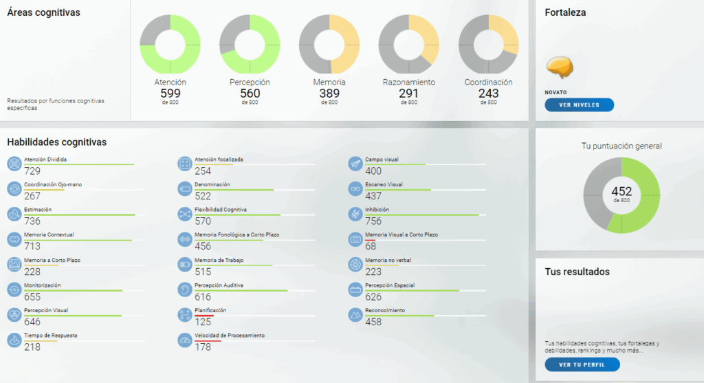 En la página que se abre verás todos los datos actuales sobre el estado de tus capacidades cognitivas. Más información sobre el sistema de puntuación de CogniFit.