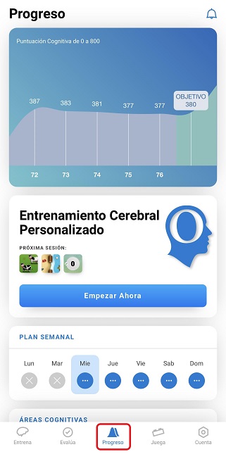 2.1 En la aplicación CogniFit, haz clic en el botón del menú Progreso situado en la parte inferior de la pantalla.