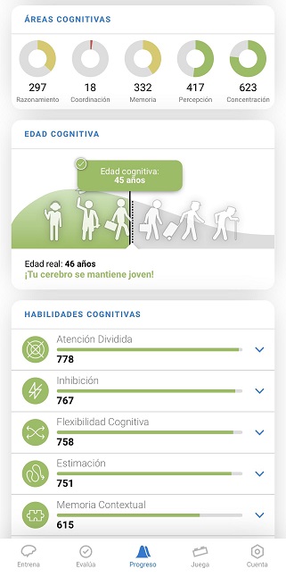 2.2 Desplázate hacia abajo hasta las secciones Áreas cognitivas, Edad Cognitiva y Habilidades cognitivas.
