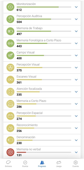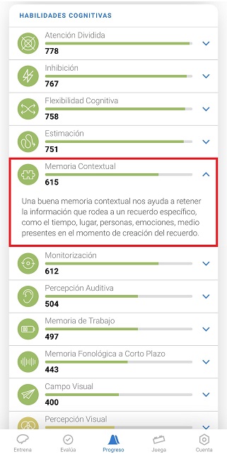 Haciendo clic en el ícono de la flecha que aparece al lado de cada capacidad cognitiva podrás consultar información más detallada sobre ella.