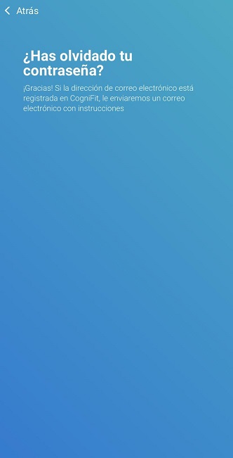 2.4 Se te enviará un correo electrónico a tu dirección con un enlace e instrucciones sobre cómo cambiar tu contraseña. Asegúrate de utilizar la misma dirección de correo electrónico que utilizaste al crear tu cuenta de CogniFit para recuperar tu contraseña. Si no has recibido el correo electrónico, comprueba la carpeta de correo basura o de spam.
