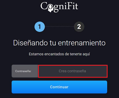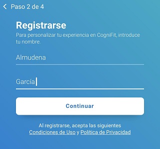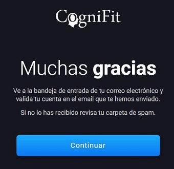 Nota: Si el familiar es menor de 16 años y va a utilizar su propia cuenta, la plataforma le pedirá que introduzca el correo electrónico de su tutor cuando se registre en CogniFit. A continuación pulsar Continuar.
