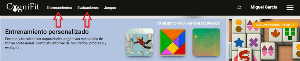 Dependiendo del programa que te haya asignado el titular de la cuenta familiar (puedes consultar esta información con el titular de la cuenta familiar), haz clic en Evaluaciones o Entrenamientos en la barra superior de la pantalla. Si es necesario, un miembro de la familia mayor de 16 años también puede adquirir cualquier evaluación o entrenamiento desde su cuenta.