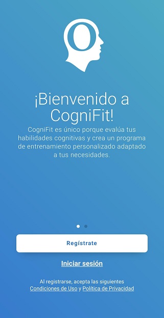 Una vez que hayas descargado la aplicación CogniFit de la tienda de aplicaciones y abras la aplicación, verás una pantalla de bienvenida. Pulsa el botón «Regístrate».