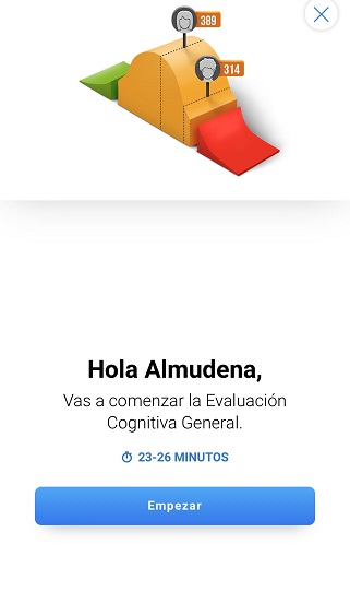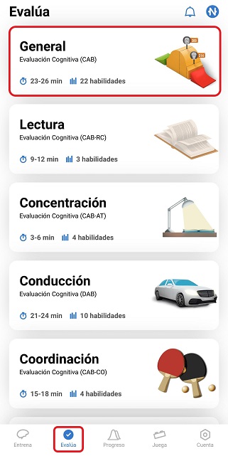 En nuestro ejemplo, al usuario se le ha asignado una Evaluación Cognitiva General. Para abrir la página de evaluaciones haz clic en «Evalúa» en el menú de la parte inferior de la pantalla y en la página que se abre selecciona la Evaluación Cognitiva General.