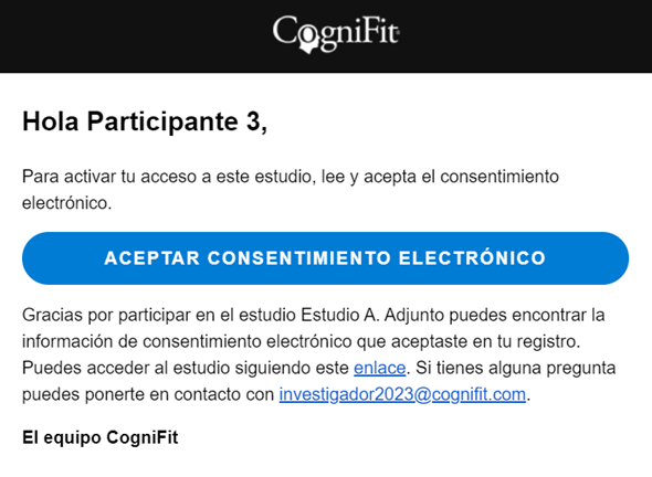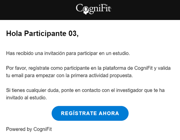 Después de que el investigador haya añadido participantes a su cuenta, los participantes recibirán una invitación por correo electrónico para registrarse en CogniFit. Ten en cuenta que el investigador también puede activar la cuenta del participante en su nombre.