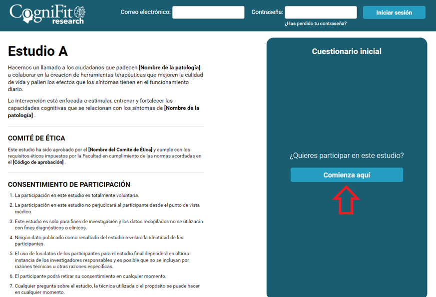 En esta página encontrarás información sobre el estudio, el comité ético, el consentimiento de participación y otra información importante sobre el estudio. Si tienes interés en participar en el estudio, haz clic en el botón «Comienza aquí» situado a la derecha de la pantalla.