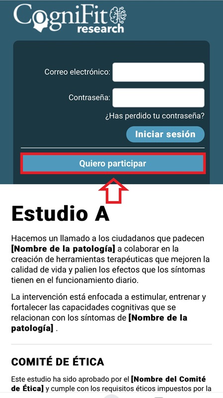 Nota: Si deseas utilizar la aplicación móvil para realizar las intervenciones asignadas, descarga la aplicación CogniFit de App Store o Google Play. Por favor, utiliza como nombre de usuario la misma dirección de correo electrónico con la que te registraste como participante en el estudio. La dirección de correo electrónico es la única forma de vincular tu cuenta de participante con la cuenta del investigador.