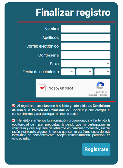 Nota: Para registrarse en CogniFit como participante en el estudio recomendamos utilizar un navegador de ordenador portátil o de sobremesa. También se puede utilizar un navegador móvil. Si utilizas un dispositivo móvil, te sugerimos que uses la aplicación móvil de CogniFit para completar las intervenciones asignadas. Recuerda memorizar y guardar tu nombre de usuario y contraseña para acceder a CogniFit.