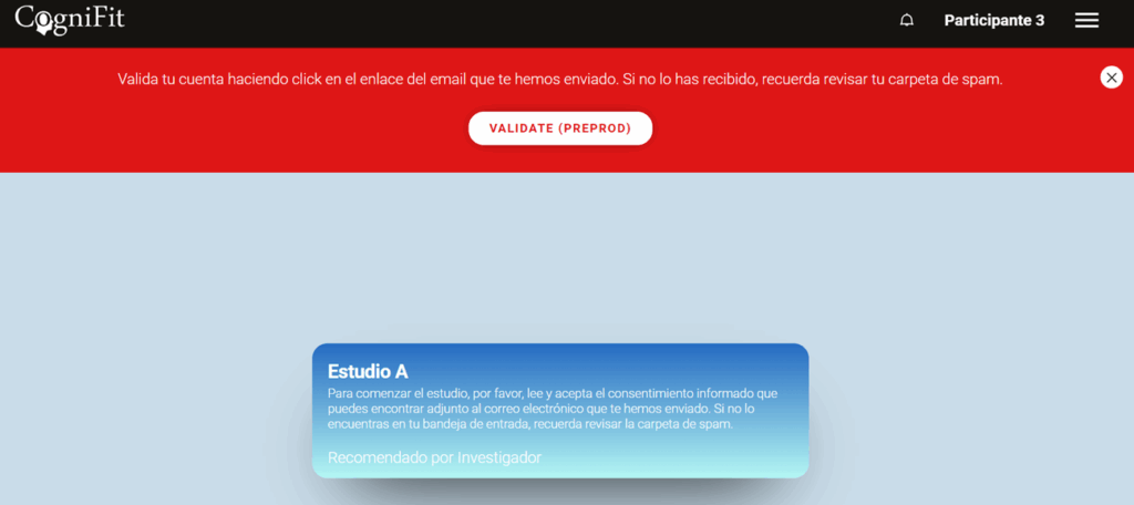 A continuación, se te redirigirá automáticamente a tu cuenta de participante y la plataforma te pedirá que valides tu correo electrónico. Más información en la sección 4 de este artículo.