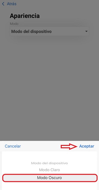 4. Se abrirá un menú en la parte inferior de la pantalla. Selecciona con el dedo el modo que te interesa. En nuestro ejemplo es oscuro. Haz clic en «Aceptar».