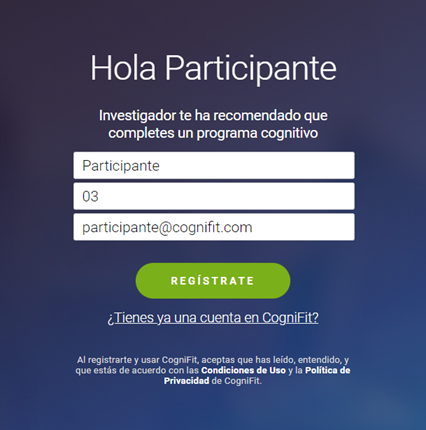 Si el investigador ha enviado a los participantes un enlace al estudio o una invitación por correo electrónico, estos usuarios invitados deberán completar el proceso de registro en CogniFit para empezar a realizar tareas asignadas.