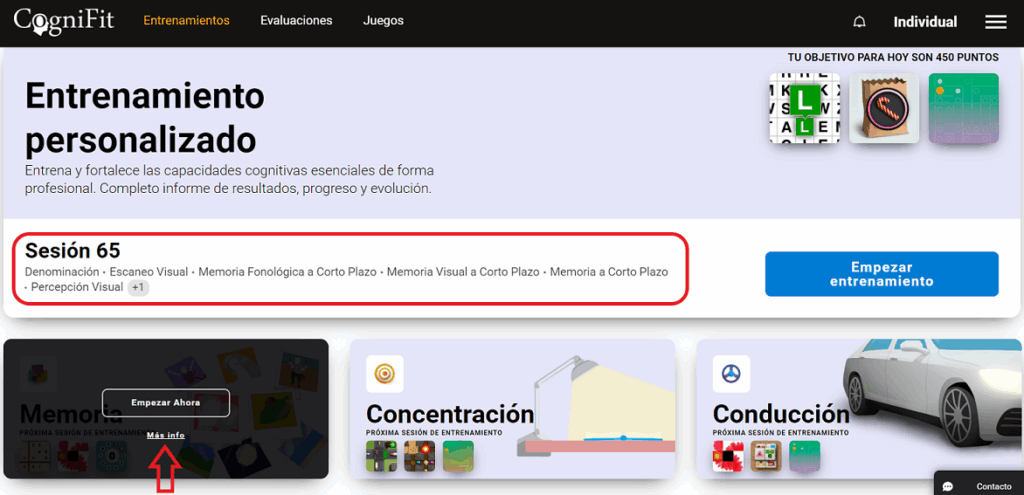 Cada programa de entrenamiento y juego cerebral mide diferentes habilidades cognitivas. En la página de entrenamientos, verás información sobre las habilidades cognitivas que se entrenarán durante la siguiente sesión de entrenamiento personalizado. Si eliges un entrenamiento específico, haz clic en «Más info» para saber qué habilidades cognitivas puedes estimular con éste.