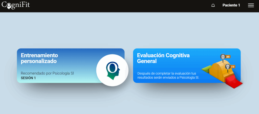 Los pacientes solo necesitan completar las intervenciones cognitivas seleccionadas por su profesional de la salud. Por lo tanto, la interfaz de la cuenta de los pacientes se simplifica enormemente en comparación con la cuenta profesional o individual.