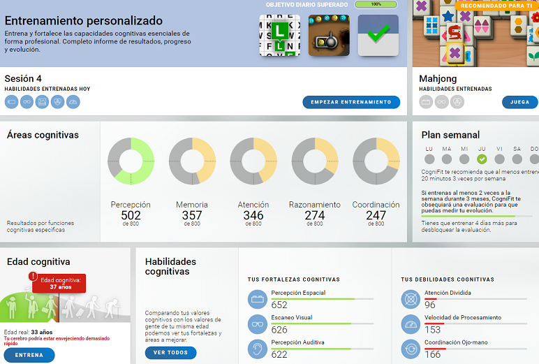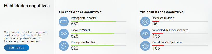 En la página del perfil, los usuarios pueden ver una selección de áreas cognitivas y su puntuación en comparación con personas de su mismo sexo, edad y región. También pueden ver una selección de las Habilidades Cognitivas que están por encima de la media de su grupo, así como las habilidades que podrían necesitar un entrenamiento adicional.
