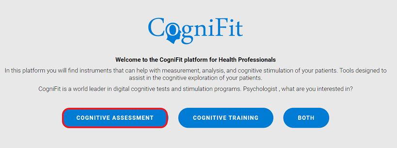 After creating a new professional account, the user will see a welcome page. You can purchase assessment licenses by clicking on the “Cognitive assessment” button. The assessment license is valid for any type of assessment on the platform.
