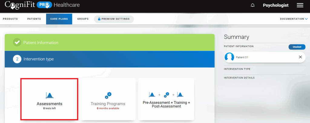 Note: The ASRS, GAD 7, and PHQ9 questionnaires, as well as basic cognitive tasks in the assessment section, are available for free. No license is required to assign them to a patient.