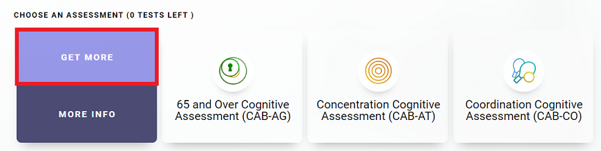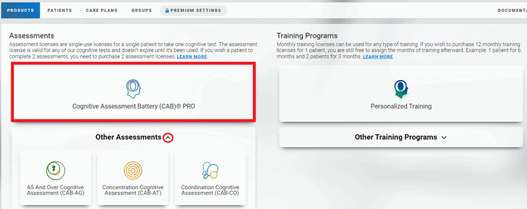 You can also purchase assessment licenses at any time from your account home page. To do so, click on the desired test in the “Products tab. Next select Cognitive Assessment Battery (CAB)® PRO or another evaluation by clicking on the drop-down menu arrow  “Other Assessments”.