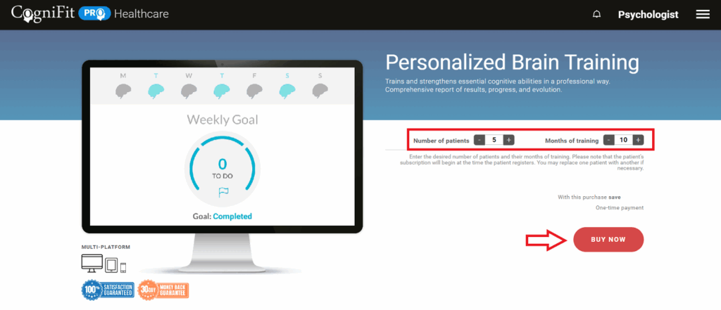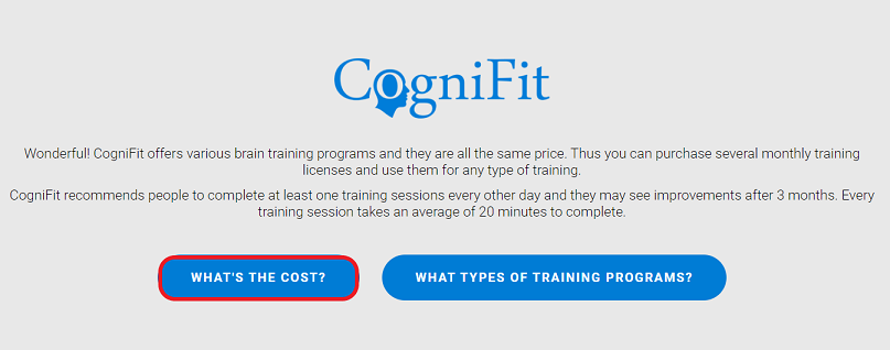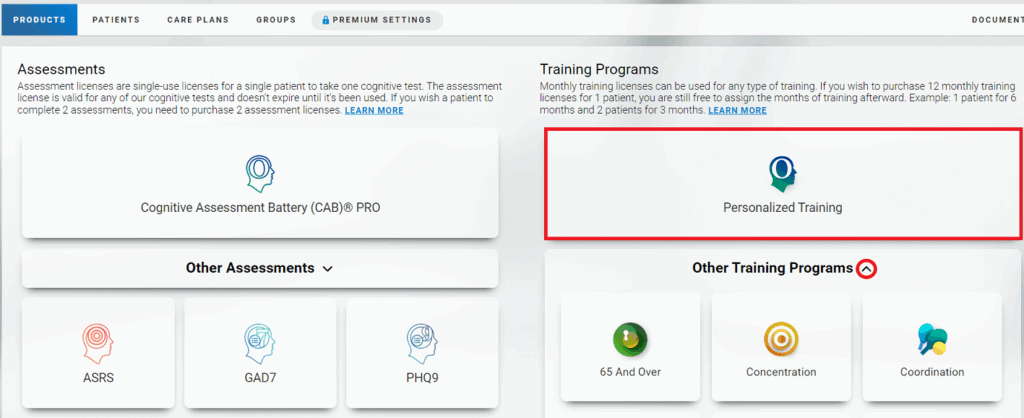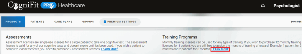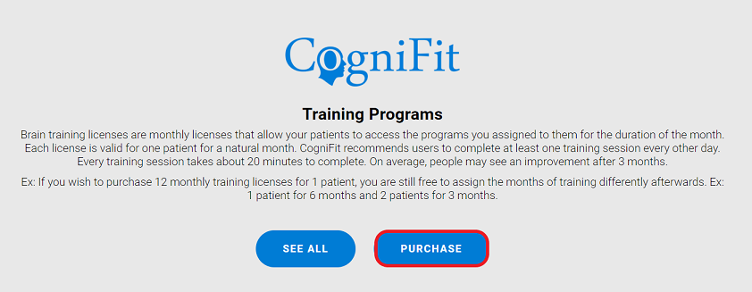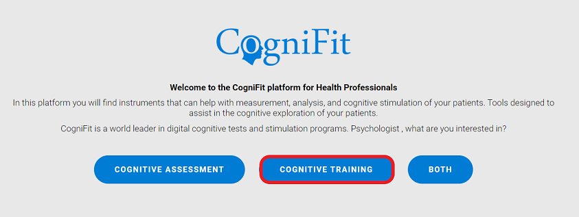 After creating a new professional account, the user will see a welcome page. You can purchase training licenses by clicking on the “Cognitive Training” button.