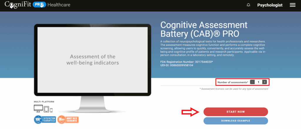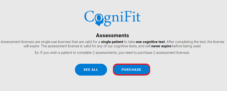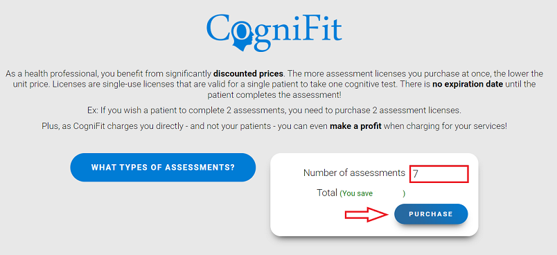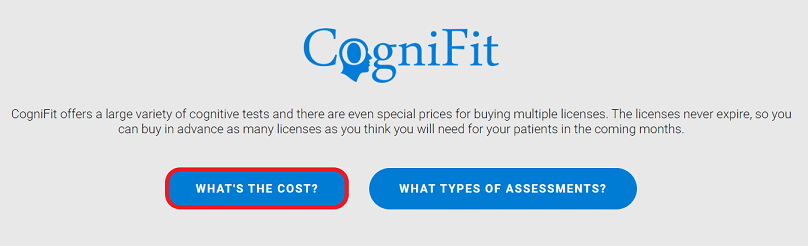 Note: As a healthcare professional, you benefit from reduced prices. The more cognitive assessment licenses you purchase at once, the lower the unit price. Learn more about how the assessment licenses work. If you want to assess the same patient multiple times, you will need to purchase as many assessment licenses as the number of assessments you want your patient to complete.