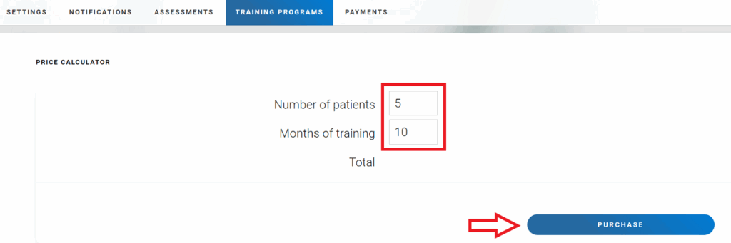 Next, select the “Training Programs” tab. On the page that opens, enter the number of patients, the number of months of their training and click the “Purchase” button.