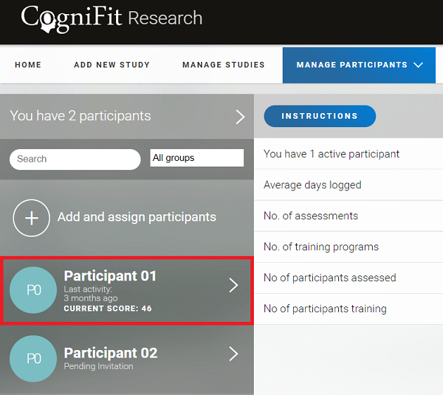 Log in to the home page of your account. Go to the participants page by clicking the blue “Manage Participants” button or the “Participants” option in the drop-down menu of the same name.