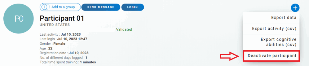 2.2 The participant’s profile page will open. To delete this user click on the “+” icon. In the drop-down menu that opens choose the “Deactivate participant” option.