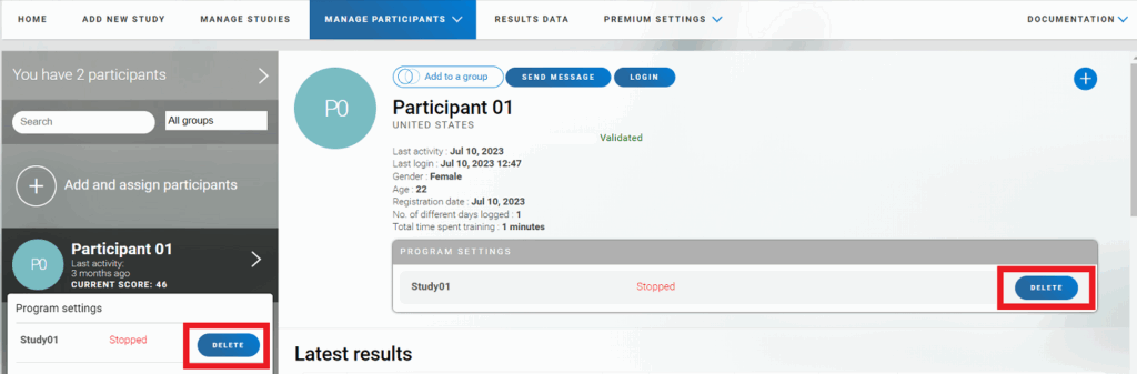 Note: You can also remove a participant from the study without deleting them from your account. To do this, hover your mouse over the participant’s name in the list and click the “Delete” button next to the study name or click the same button directly in the participant’s profile.