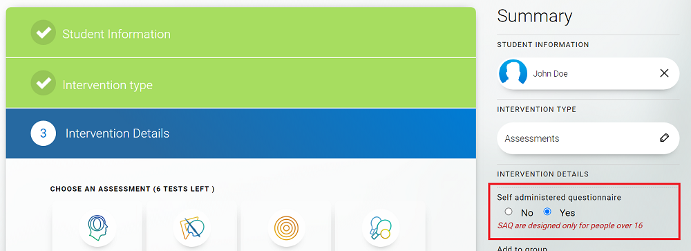 Note that all of the assessments start with a questionnaire. If you would like to complete the questionnaire yourself, and not the student, click on the “no” option in the “self-administered questionnaire” area.