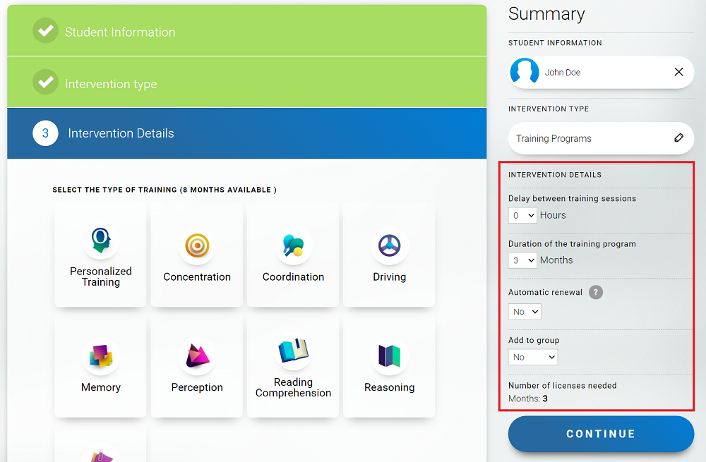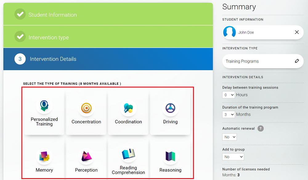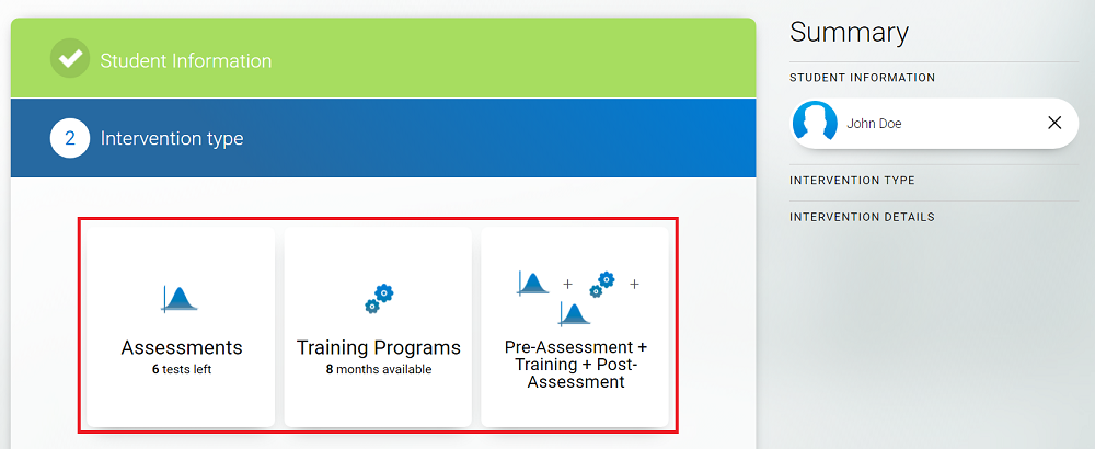 Once you have purchased assessment licenses and/or monthly training licenses, you are ready to add students to your account and select their intervention in a few clicks.