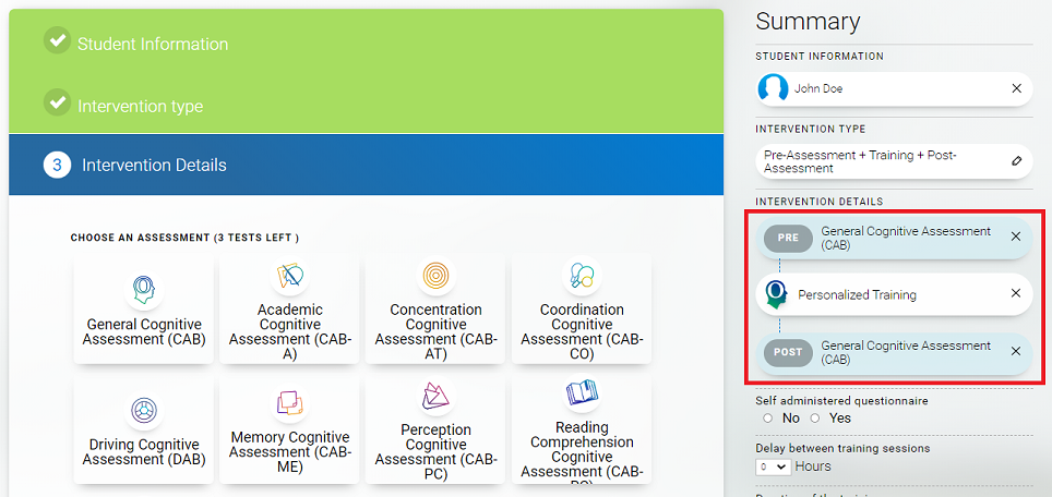 Choose the type of assessment and training program you would like the student to complete.