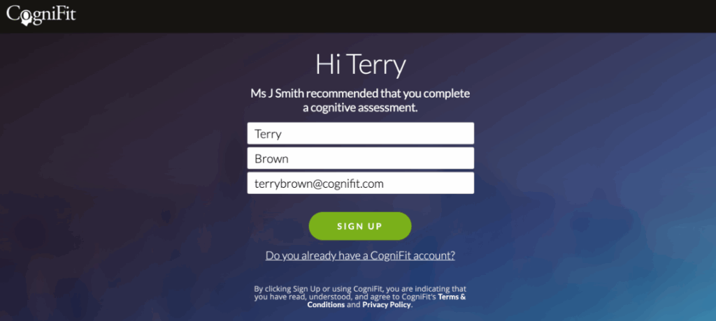 6.1 If you click on the “Send” button, an email will be sent to your student with a link. When the student clicks on the link they can register their own account with CogniFit and start their intervention.
