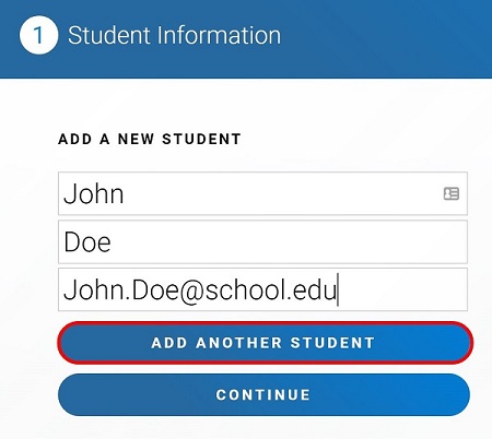 3.3 If the educator wants to add multiple students, they should enter the details of the first student and click Add Another Student. This process should may be repeated until the educator has added all students. When complete, press Continue