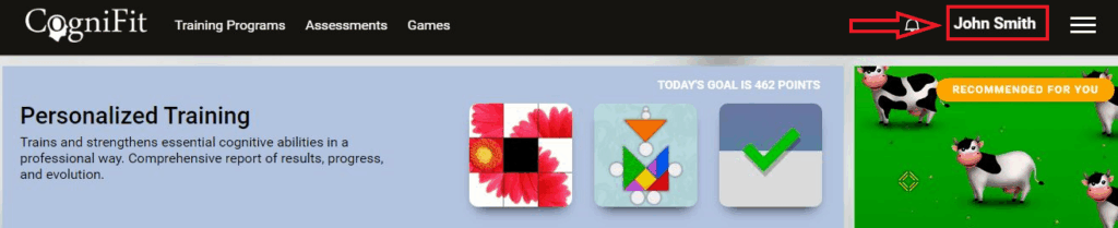 1.1 Log in to your CogniFit account and click on your name in the upper right corner of the screen.