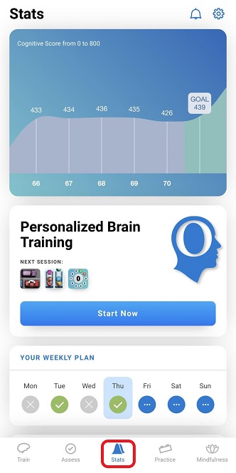 2.1 Open the CogniFit app and sign in to your account and tap on the icon labeled Stats.